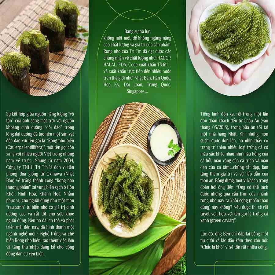 Sự kết hợp giữa nguồn năng lượng “vô tận” của ánh sáng mặt trời với nguồn khoáng dinh dưỡng “dồi dào” trong lòng đại dương đã tạo nên một sản vật độ đáo với tên gọi là “Rong nho biển (Caulerpa lentillifera)”, một tên gọi còn xa lạ với nhiều người Việt trong những năm về trước. Nhưng từ năm 2004, Công ty TNHH Trí Tín là đơn vị tiên phong đưa giống từ Okinawa (Nhật Bản) về trồng thành công “Rong nho thương phẩm” tại vùng biển sạch ở Hòn Khói, Ninh Hoà, Khánh Hoà. Nhằm phục vụ cho người dùng như một món “rau xanh” từ biển nhờ có giá trị dinh dưỡng cao và rất tốt cho sức khoẻ người dùng. Nên nó đã lan toả và phát triển mãi đến nay, đã hình thành một ngành nghề mới – Nghề trồng và chế biến Rong nho biển, tạo thêm việc làm và tăng thu nhập đáng kể cho cộng đồng dân cư ven biển.
